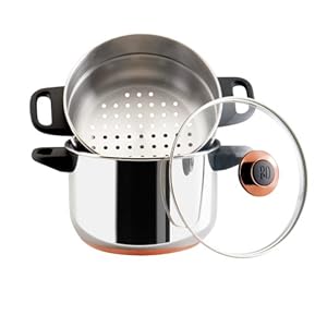 A thick aluminum disk base with a full cap of gleaming copper heats quickly and hold in the heat. The warm sparkle of copper complements the bright radiance of stainless steel